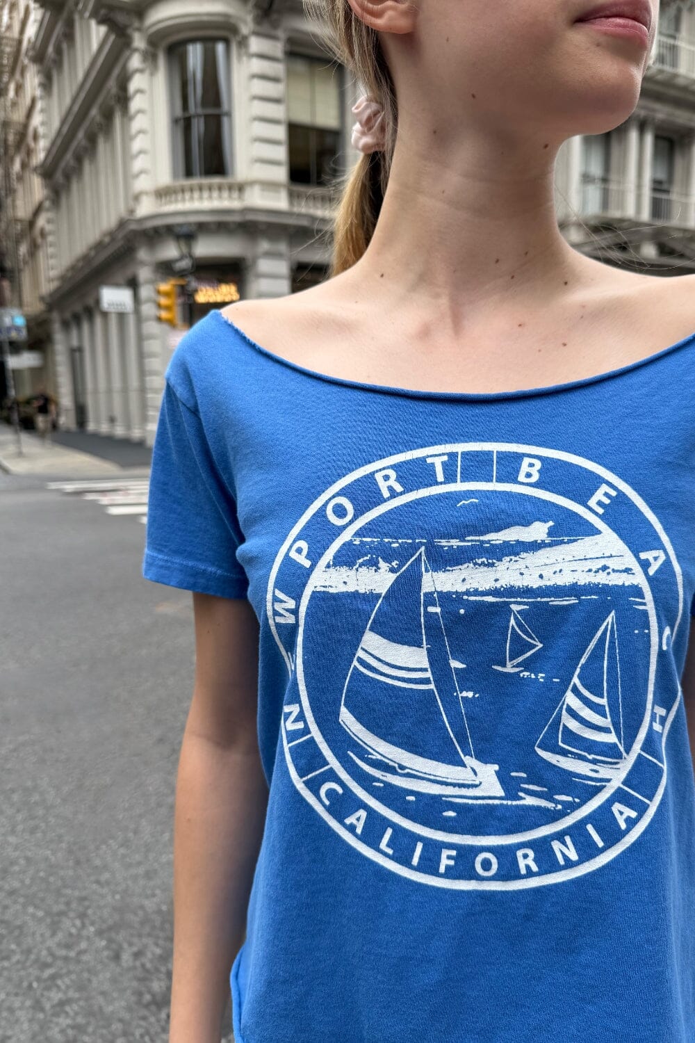 Steel Blue lightweight cropped wide neck, off the shoulder cotton top with raw hem with ” Newport Beach California” graphic printed in white on the front.